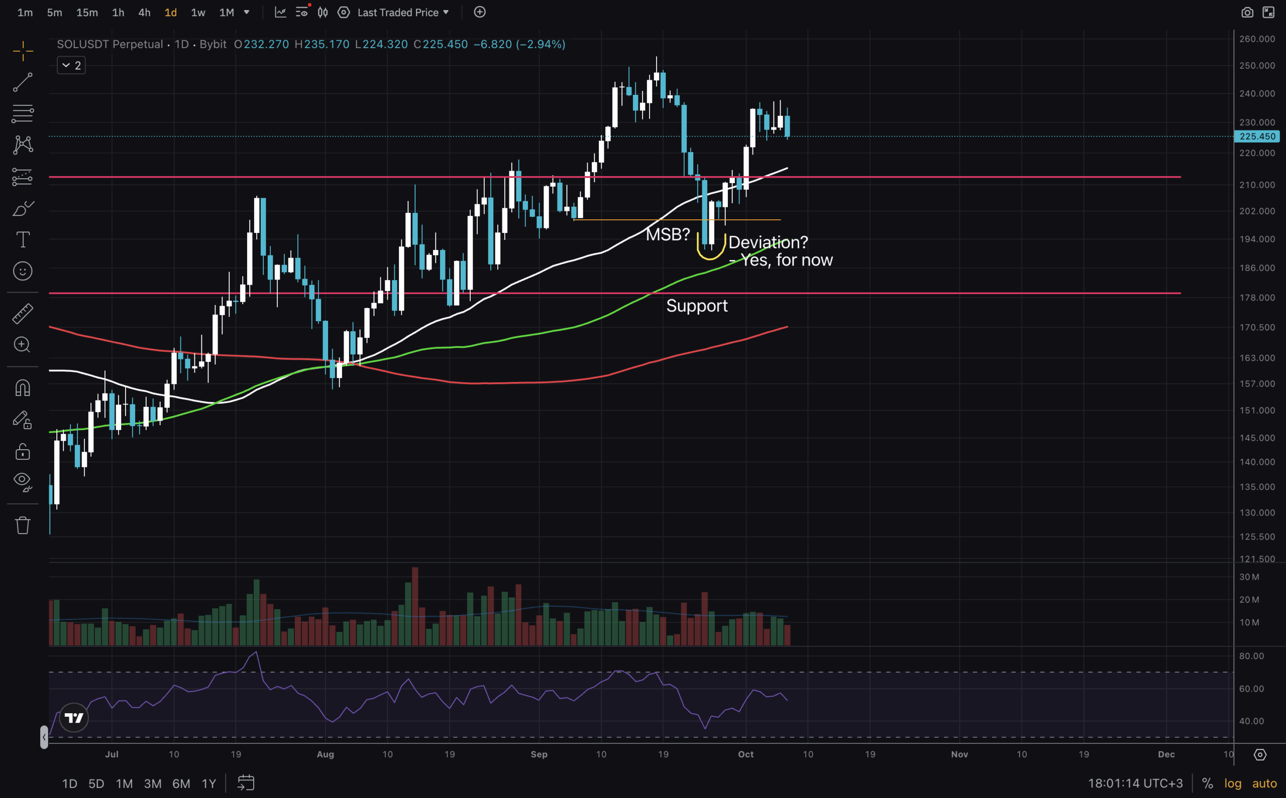 On the 1D chart RSI additionally has good headspace left to run. Shifting Averages are additionally trending upward. We had a possible deviation under a earlier low at $200. It gained’t be a deviation if value goes down there once more. Although if it does, the uptrend stays till MAs flip round and we’ve a transparent decrease excessive and decrease low value construction.