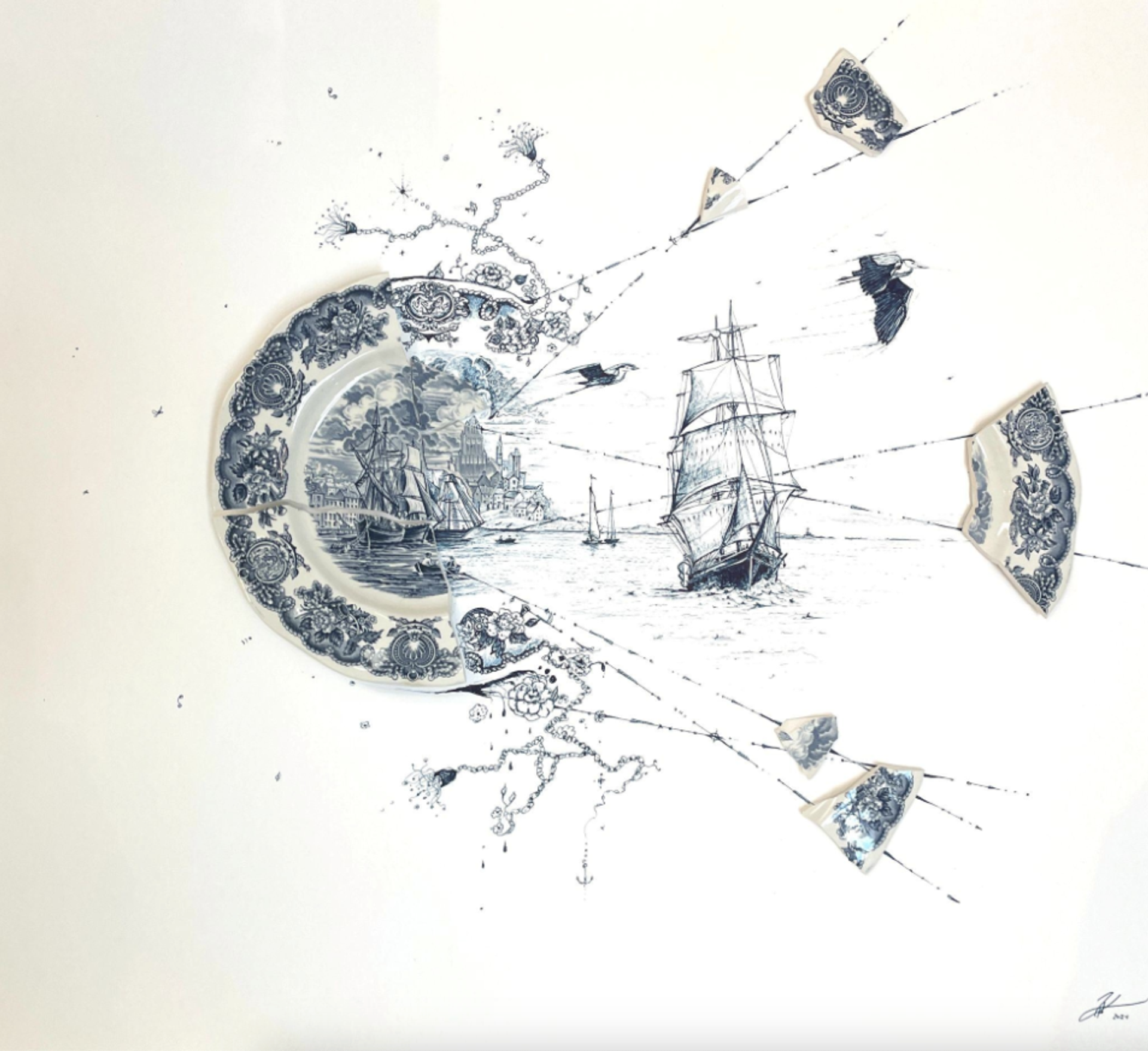 On the adjoining wall, Strati’s works deliver collectively intricate drawings with damaged vintage dinner plates in distinctive sculptural collages (priced from $12,000 to $15,500). His collection, Fragmented, started when the artist by accident broke a porcelain plate, a present from his mother-in-law. Somewhat than throw away the items, he determined to increase the plate’s design within the type of a drawing—in a method, placing the plate again collectively whereas giving it new function by exploring a attainable story past its confines and discovering magnificence within the chaos of its destruction.