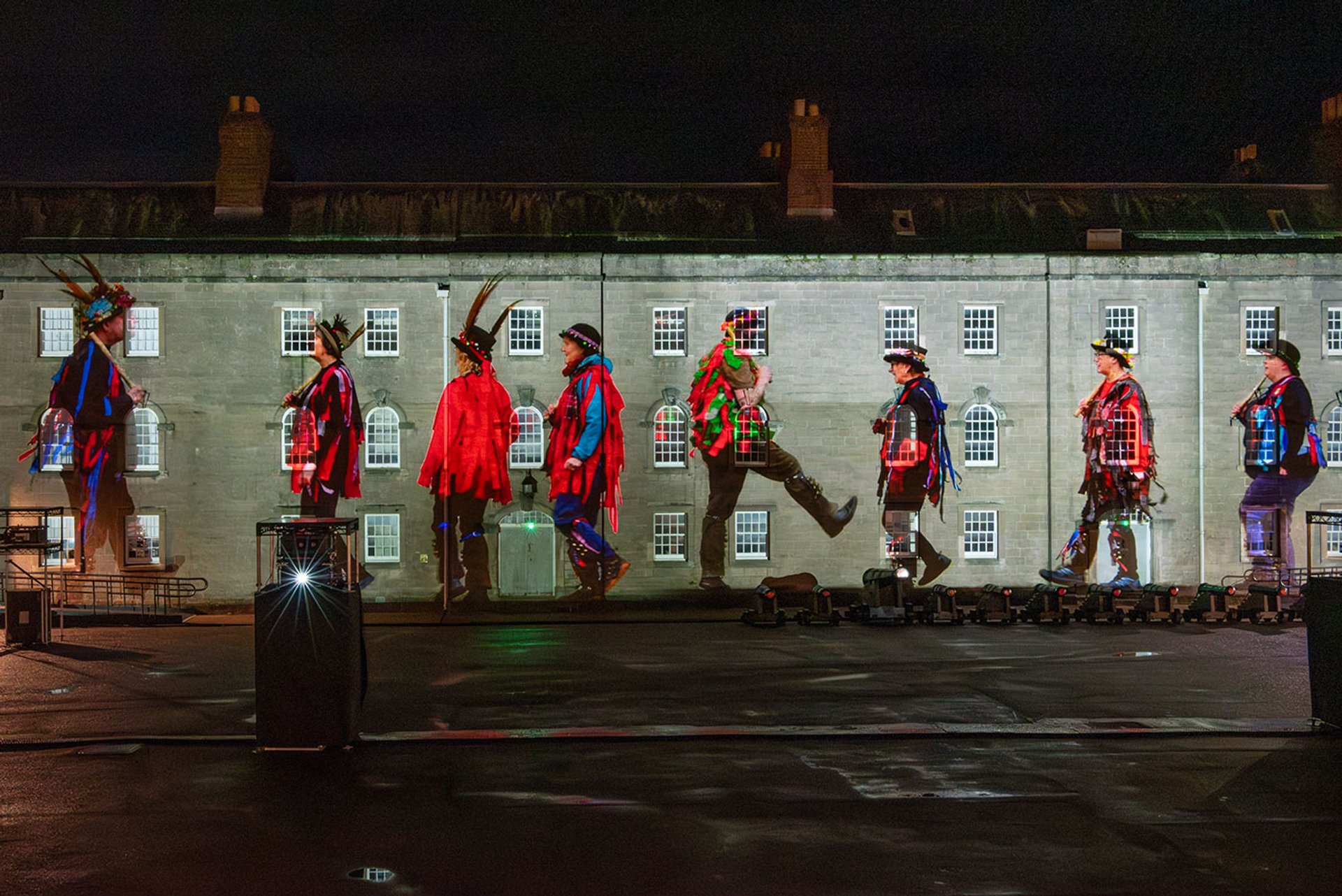 Rag Bag Morris dancers are projected onto the partitions of the barracks parade floor, Berwick-upon-Tweed, as a part of Matthew Rosier’s movie Parade (2025) Jennifer Charlton Pictures / Courtesy of The Maltings Berwick Belief