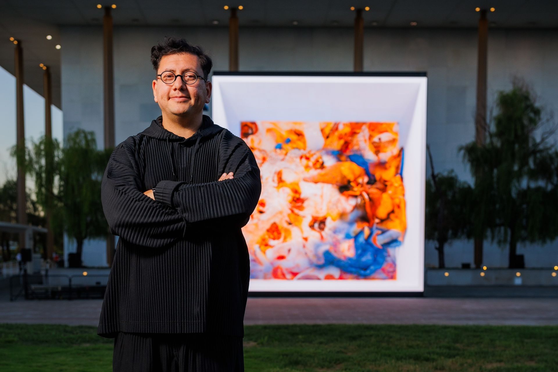 Refik Anadol along with his work Dvořák Goals, introduced by 0xCollection and the Kennedy Middle on the Attain Plaza Photograph: elman studio. Courtesy of 0xCollection and The Kennedy Middle