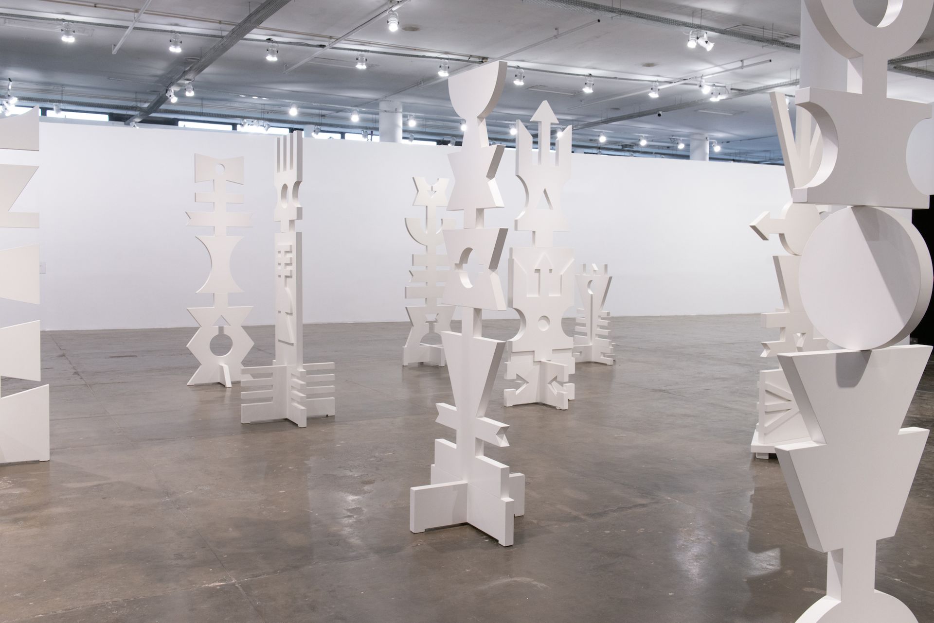 Different works discover the theme via a extra summary method, like a collection of works by the Brazilian artist Sonia Gomes, who intertwines discovered or gifted textiles into lyrical sculptures which can be impressed by the dynamism of Brazilian dance. One other centrepiece of the exhibition is the late Brazilian artist Rubem Valentim’s Templo de Oxála (Oxalá Temple) (1977)—an set up comprised of 20 white sculptures, most which can be being proven collectively once more for the primary time for the reason that 1977 Bienal de São Paulo—that evokes liturgical Afro Brazilian types via rhythmic geometric contours.